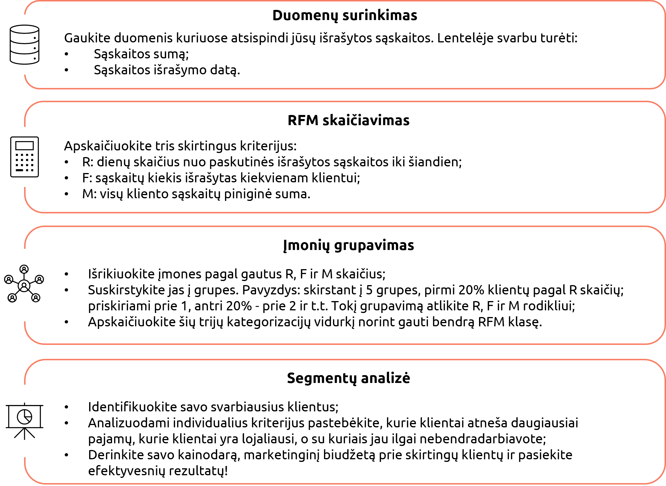 Šie trys rodikliai kartu parodo, kokią svarbą kiekvienas klientas turi jūsų verslui. Papildomai analizuojant kiekvieną kriterijų atskirai, galima identifikuoti lojaliausius klientus (dažniausiai perkančias įmones) arba pelningiausius klientus (įmones, kurios generuoja daugiausia pajamų). RFM analizė yra plačiai pripažinta visame pasaulyje dėl savo paprastumo ir efektyvumo. Štai ko jums reikėtų, norint atlikti šį pratimą su savo kolegomis jau šiandien: